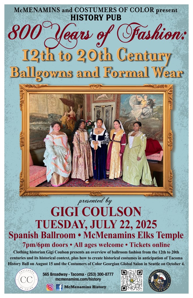 This fall in Seattle: Our 18th-century Georgian Salon will highlight the global world of the Georgian era. People of African, Asian, and Indigenous descent shaped history then—and will be celebrated now. We can’t wait to see what you wear! If you’re interested in learning more about Georgian fashion in advance of the event, tune into our YouTube channel in August for our presentation and slideshow.